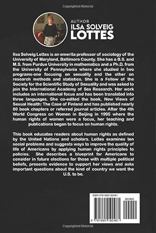 One goal of this book is to educate Americans and others about the meaning of Human Rights as defined by documents of the United Nations and scholars. Lottes examines ten major domestic social problems in the U.S. and describes how these problems could be reduced if policy makers considered the human rights impacts of the policies they propose. She assumes that If human rights-based frameworks guided social policy, fewer violations of these rights would occur. She proposes specific policies consistent with human rights to reduce these ten social problems. In doing so, she provides a blueprint of questions and information to consider before voting in future elections. In addition, she proposes mandatory education in both human rights and empathy for all American citizens from grades K-college. Lottes presents evidence for her views and asks questions important questions about the kind of country we want the U.S. to be.